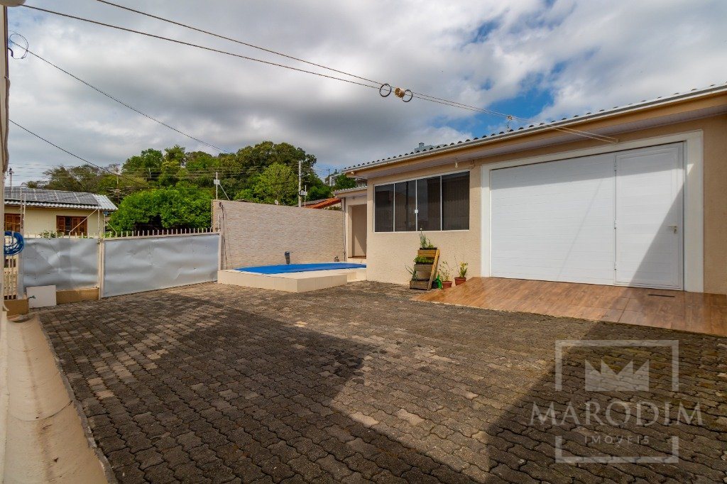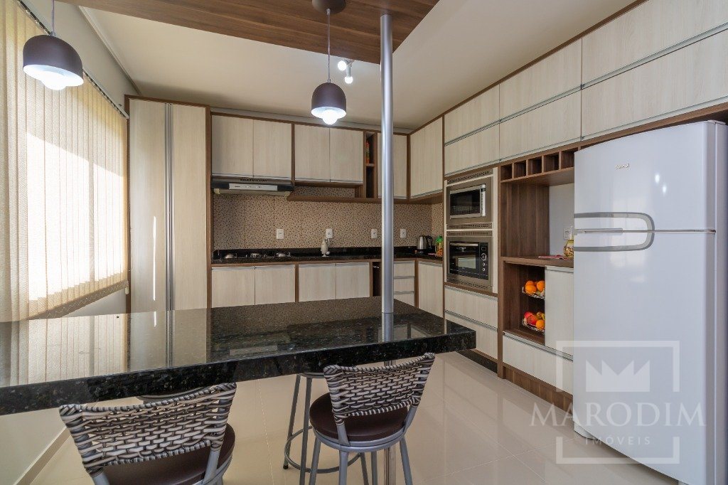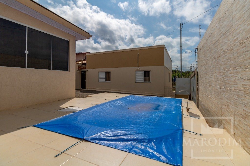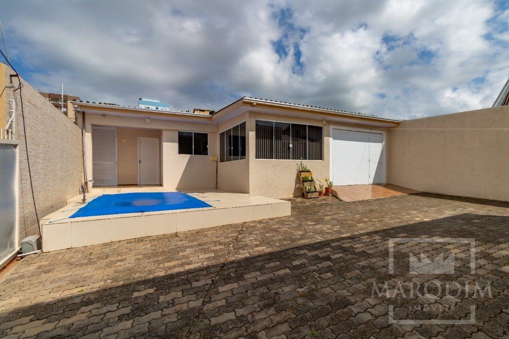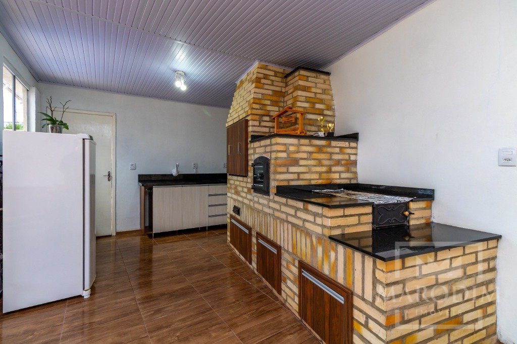 Conta com garagens, dois banheiros, área de serviço, cozinha, três dormitórios e sala de estar.