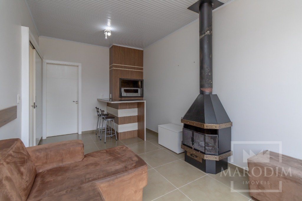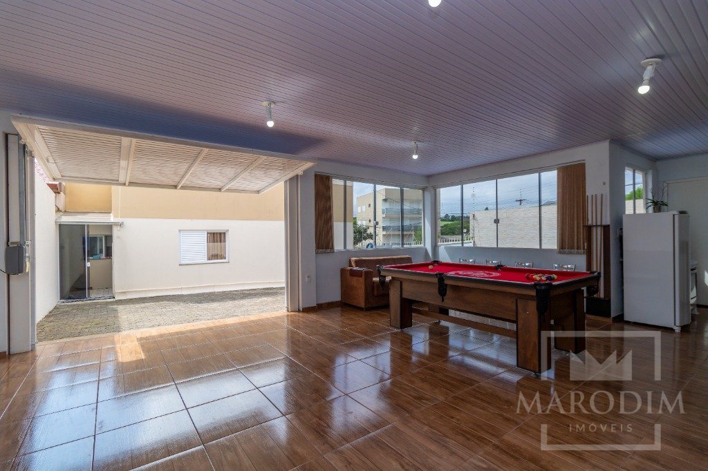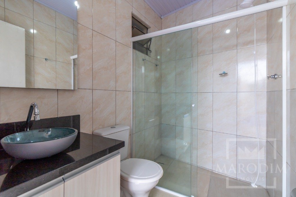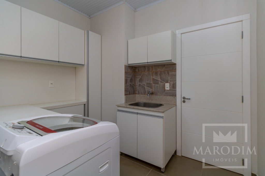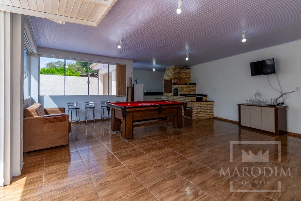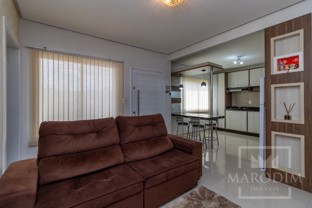 Conta com garagens, dois banheiros, área de serviço, cozinha, três dormitórios e sala de estar.