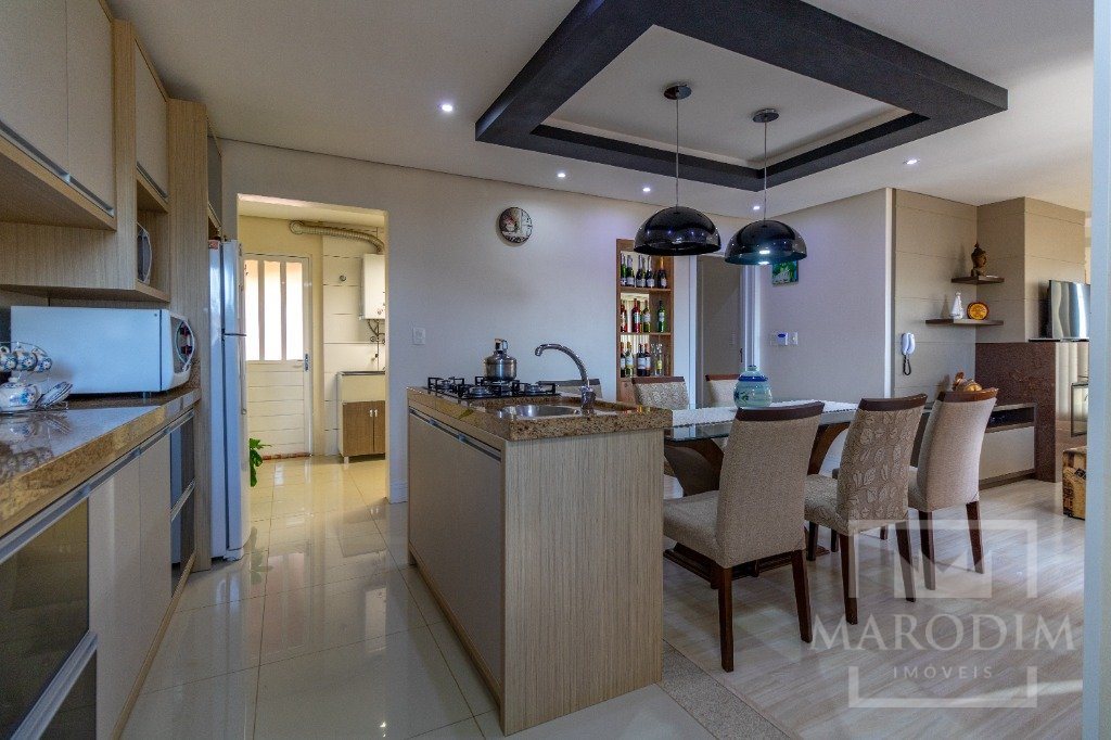 A cozinha planejada se integra à sala de jantar e estar, criando um espaço acolhedor para reunir a família.